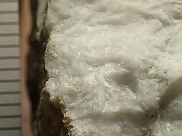 2つ目の特徴は、ヒスイ輝石の結晶が大きいことです。 ヒスイ輝石岩中のヒスイ輝石の結晶はたいへん小さく、肉眼では見えないことがふつうです(隠微晶質)。しかし、大屋のものは結晶が大きくて見えることがあります(結晶質)。 破断面に光を当てていろいろな角度から見ると、光をキラリと反射する細長い平面が見えます。これは、ヒスイ輝石の長柱状結晶の結晶面や劈開面です。 結晶の長さは5mm程度はふつうで、大きいものでは30mmを越える場合があります。劈開面には、それと垂直に交わる劈開が平行な線として観察できます。 柱状結晶の方向は、平行ではなく互いに交差していることも観察できます。また、放射状に集まっているところもあります。結晶がお互いにさし込むように組み合わさっていることが、簡単には割れないヒスイの堅牢さをつくり出しています。