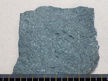 2.猿尾滝ひん岩 猿尾滝に分布している岩石は、「猿尾滝ひん岩」と呼ばれています。ひん岩とは、安山岩質の半深成岩をさす岩石名です。斑晶と石基からなる斑状組織をしていて、岩脈などの貫入岩にこの名前が用いられることが多いようです。 最近では、半深成岩の名前はあまり使われなくなり、それにともなってひん岩の名前も使われなくなりました。したがって、猿尾滝の岩石は安山岩とした方がいいのかもしれませんが、「猿尾滝ひん岩」の名前が定着しているのでこれを用いることにします。 猿尾滝ひん岩は、滝の下のウォータースライダーのようになった岩盤で観察できました。緻密で硬い緑灰色の角閃石ひんです。 斑晶として、長柱状の普通角閃石(最大4×1mm)と板状の斜長石(最大2×1.5mm)が含まれています。 同じ岩石は、上段の滝の下でも観察できました。