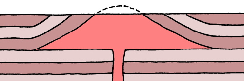 上段の滝に向かう遊歩道では、やや細粒の閃緑岩が見られました。風化が進んでいるので、はっきりとはわかりませんが、ひん岩と閃緑岩の中間型の岩石のように見えます。 ひん岩と閃緑岩は同じ岩体の岩石だと考えられます。貫入したマグマが周縁部で速く冷え固まるとひん岩になり、中心部でゆっくりと冷え固まると閃緑岩になったと考えられるのです。ただ、このような説明も岩相のちがいを岩体の分布や形と合わせて考えないといけないので、さらなる検討が必要なのかもしれません。 3.猿尾滝の岩体はラコリス 猿尾滝の岩体は、かつては岩脈と考えられていました。それが、2017年に出た論文、羽地ほか(2017)によって岩脈ではなくてラコリスであることがわかりました。 マグマが地層や岩石中に入りこむことを貫入といい、貫入して固まったものを貫入岩体といいます。貫入岩体は、その貫入のしかたや形態によって分類されています。代表的な貫入岩体に岩脈(dyke)、岩床(sheet・sill)、ラコリス(lacolith)があります。 岩脈は、マグマがまわりの岩石や地層を切って貫入し板状になった岩体です。 岩床は、マグマが地層面にほぼ平行に貫入し板状になった岩体です。 ラコリスは、水平に近い地層の間にほぼ地層面に沿って貫入し、上の地層を押し上げて「そなえ餅」のような形になった岩体です。