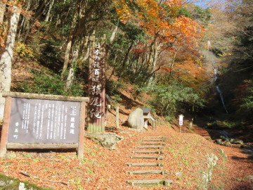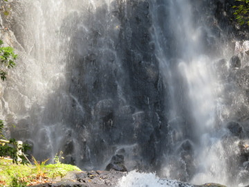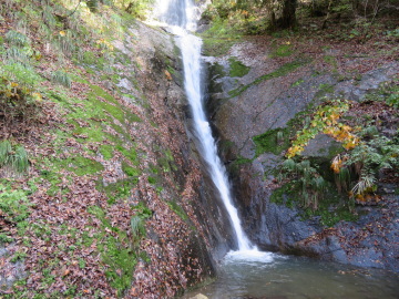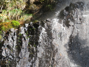 道は下段の滝に行く道と上段の滝に行く道とに分かれています。まずは、下段の滝へ向かいました。 下段の滝は、一筋の水がなめらかな岩肌の溝を一気に流れ下っています。水は、三角形の形をした滝つぼに勢いよく落ちて、白い水しぶきを上げていました。滝のこの姿・・・猿のしっぽに似てるかな?