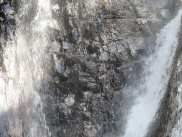 この閃緑岩の岩体には、縦と横の節理がやや不規則に細かく入っています。そのため、上段の滝は割れ目が多く岩肌がごつごつしてしています。 この節理による割れ目が、滝の飛沫を生み出し、滝に見られる仏様などの造形をつくり出しています。