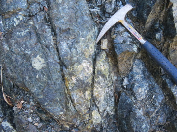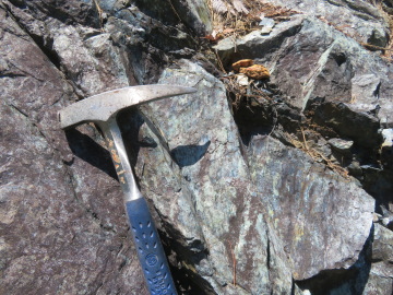 この露頭の下の方には、黒くて塊状の蛇紋岩が見られます。ハンマーで割った面を観察すると、アンチゴライトと思われる暗緑色で柱状の結晶が束状に集まっているのが見えました。