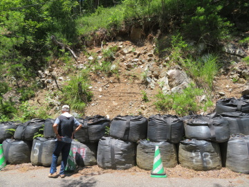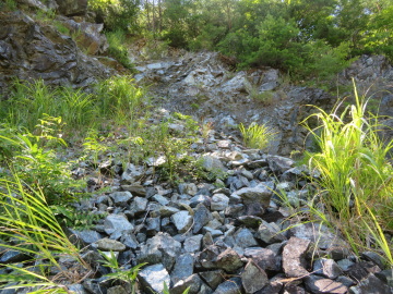 加保坂に向かって道を上っていきました。あたりは蛇紋帯で、道の法面のところどころに蛇紋岩の露頭が出ています。 蛇紋岩露頭①では、法面が崩れています。蛇紋岩はもろく滑りやすいので、このように斜面は崩れやすくなります。
