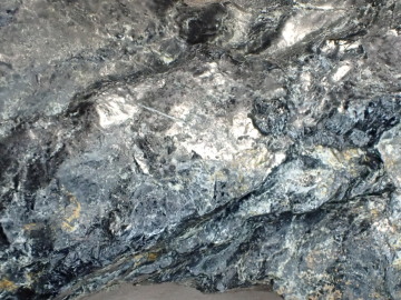 蛇紋岩露頭③では、脂肪光沢のあるすべすべした触感の蛇紋岩が見られます。滑りやすく、ハンマーでたたくと葉片状にうすくはがれるように割れます。割れた面を見ると、こすれあった跡が筋となって残っています。 表面の色は、青・緑・黒があって、そこに白や黄色が混ざってまだら模様をつくっています。 複数の種類の蛇紋石や緑泥石からなっていると思われます。また、磁石が強く引きつけられるので、磁鉄鉱をふくんでいることがわかります。