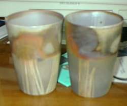 - 今回買ったカップの模様は灰釉だろう。窯に入れる前に藁で十文字に縛り,カップの上部は何かを巻いた。藁中のプラントオパールが溶融し,線状の模様を作り,上部に巻きつけたものに灰を入れて、灰釉や赤褐色の発色を期待したのだろう。
