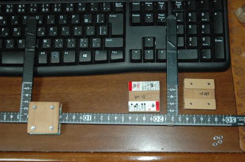 安いL字スケール2本を重ね、4cm×4cmのホオ板2枚でL字スケール2枚分のスペーサーを横に挟んで4本のボルトとナットで固定。L字スケールの短辺を黒色布製ガムテープを巻きつけてつけました。 スペーサーの厚さが0.1mm違うとL字スケールの滑らかな動きが違う。 |