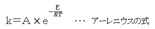 ここで、A:頻度係数、 E:活性化エネルギー、 R:ボルツマン定数、 T:絶対温度