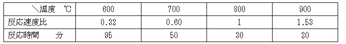 B予想反応時間の比較: 800℃の反応速度比を1、反応時間を30分とした場合、上記式を600、700、800、900℃で比較すると次の様になる