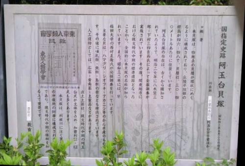 | 昭和43年5月20日に国指定遺跡に指定された勘定貝塚と書かれています。また、「古くから周知され」明治27年に発掘調査が行われ、”縄文中期の標準遺跡”となったことから全国に知られるようになったと書かれています。この説明版には「あたまだいかいづか」と記されています。 (「阿玉台式土器は関東地方の縄文中期初葉の標識土器となった」というのが正しいと思いますが) | 「国指定史跡 阿玉台貝塚」との立派な石碑が建てられています。この石碑の左手は墓地になっており、貝塚全体を撮影することはできませんでした。右手は梅園になっており、木道が設置されています。現在、貝塚の全体/周辺を見ることが出来ませんでした。すぐ近くにある国指定良文貝塚を含めて、千葉市にある5つの国指定貝塚の状況と比べて、違うことを知りました。国土が狭い日本、現代と古代が数十pで隣り合っています。うまく付き合うのも考えなくてはと思いさせられました。さらに、藤原将門の変の本質に触れてみたいと思いました。 |