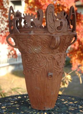 | 左: 2006年。 津南火焔型土器。津南市のなじゃもんに展示されている70cm級の土器です。なじゃもんに行って作りたいと思い、始めましたが、口縁部と胴部の接合が写真を見てもわからず、再度行って接合部を徹底的に写真を撮って詳細に確認。やはり不整合。博物館の人に聞くと、出土した時に口縁部と胴部以下は離れており、別々に成型してから繋げたのではないか とのこと。左の画像は成型6回目のもの。2014/3/11の地震で倒れた際に鶏頭冠を含む後部が割れて数十の破片に。気長に修理しようと思っていたら、しっかりと残っていた胴部を倒してまた壊して、修理をやめました。2006年に比べて成型の腕が上がったので、もう少し小さな火焔型土器を作ります(2014年の考古学総会で十日町市博物館の人の火焔型土器の構造をCTスキャンで分析するとの発表があり、作り方もはっきりしてきているようです)。 右: 2008年。 関西胴下部穴有。 |