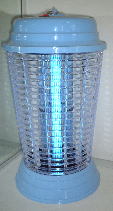 蚊採り灯 青白い不気味な光を放って、部屋の隅にたたずんでおり、その光におびき寄せられた蚊が、ランプのそばの電線にあたると、「バシッ」という音と共に、高電圧が流れて死にます。私の友人は、あの「バシッ」という音を聞くと爽快になるといいます。しかし、この蚊取り灯に就いては、効果を疑問視する声が多くあります。台湾の友人の一人は、「最初は、よくひっかかるのだけど、しばらくして、蚊が賢くなって、ひっかからなくなる」と、もっともらしいが、信じがたいことを言ってくれます。私の息子は、この灯に向かってウチワで風を送っただけで、「バシッ」と音がするのをみつけ、音がするほどには蚊を殺していないと主張しています。さらに疑問なのは、ランプの底に溜まっているであろう蚊の死骸がみあたらないことです。さらに、どのように掃除するかも分からないのも不思議です。 |