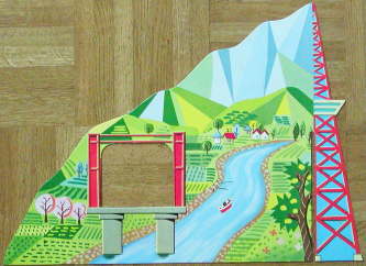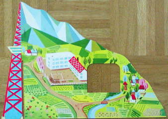 ボール紙の両面にカラー印刷されているのは、都会の景色と田舎の景色