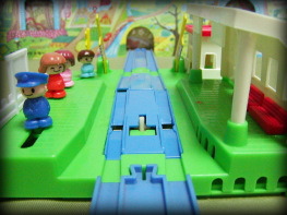 この緑ベースのものに、後年人形の動くギミックを追加したものが「まちのえき」というわけだ