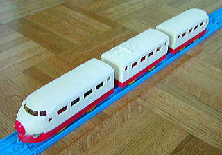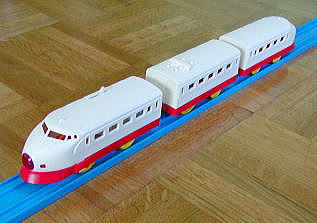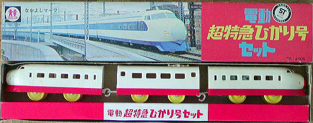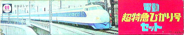 平成11年に発売された「親子で遊ぼう新幹線セット」に500系と一緒にセットされた復刻版 復刻版とは銘打っているが、実際には現行の「ライト付ひかり号」の金型を使ったお手軽版で真の復刻とは言えないが 赤白ひかり号のバリエーションとしては面白いかも この後、トミーは本当に当時の金型を使って、寝台特急や特急電車の復刻を行うようになる もし当時の金型が残っているのなら、本当の「電動超特急ひかり号復刻版」を出してくれません? |