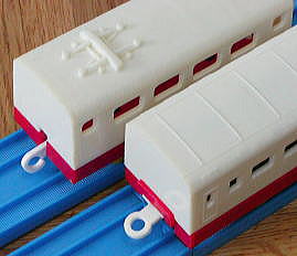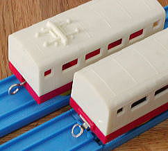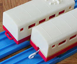 初代(屋根スイッチ) 上のモデルの改良版として生産されたもので、スイッチが屋根に移動したのが一番の特徴 ボディの型は同じものを使用しているが、連結器は、牽引側がボディマウントの独特なタイプ この連結器は、同時代の電動プラ電車にも採用されたが、破損した場合修理が不可能なため、短命に終わった 箱はシールで「新」の文字が追加され、前スイッチモデルとの差別化をはかっている |