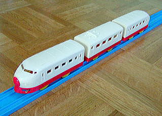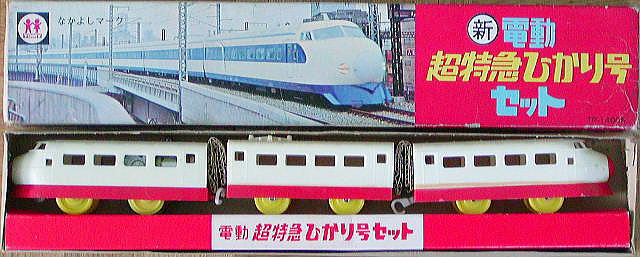 2代目 先頭車と後尾車の金型が新たに作られ、別のタイプとなった 運転席のピラーも実車にあわせた形になっているが色は相変わらず赤白のままとなっている なぜか中間車はそのまま使用されたため、3両並べると窓のピッチが微妙に異なっているのがわかる (ちなみにこの中間車の型はその後「とっきゅう」や「D51急行」などにも使い回されている) 箱のデザインは同じだが、「STマーク」が貼られているのが違いとなっている さすがに赤白のデザインが実車とかけはなれているのがトミーも気になったのか、 1年ほどで生産が終了し、実車のカラーリングに合わせた「ちょうとっきゅうひかり号」が発売されたため 2代目の金型で赤白タイプのものは現存数が非常に少ない |