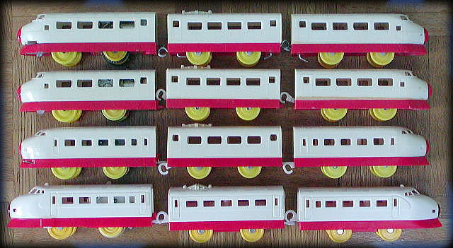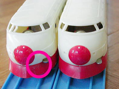 | 初代(前スイッチ) 電動超特急ひかり号の最初のタイプです ボディの型は初代、スイッチは前ですが、ギアボックスが車輪と直結されており、空回しができません また、連結器も金属製となっています |