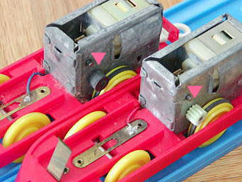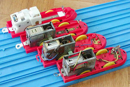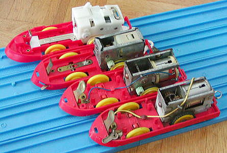 動力ユニットの変遷(手前から、初代前スイッチ、初代屋根スイッチ、2代目、復刻版) 初代前スイッチはギアボックスと車輪が直結されている 初代屋根スイッチからは、いわゆる旧動力方式の間接動力伝達となっているが、 摩擦ゴムのかわりにピニオンギアが使用されている (ピニオンギアは割れやすく、この後摩擦ゴムが開発されたものと思われる) |