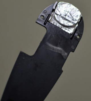 対処法としては、このプラ板パーツをハズし、指で押した部分の裏側。メカボックスと接触する部分にテープを張っていき、厚みを増してから組み込みます。