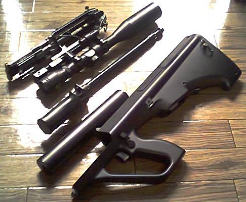 AUGはアウターバレルが簡単に外せるので、アウターバレル、インナーバレル、チャンバーなどのセットの予備が手に入った場合は、この方法で通常のバレルとサイレンサーのバレルの二本を簡単に付け替えて使う事ができます。