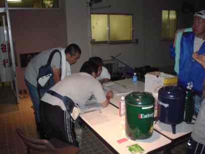 | 明日の打ち合わせをするボラセンスタッフ | この日の宿舎は禁酒なので屋外での晩餐 |