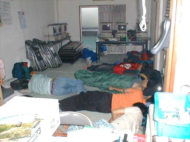 西日本中継基地には、すでに広島RBさんが到着していました。上部左の写真は、明日の打ち合わせをしているのですが何故か手元には缶ビールとおつまみが散乱しています。右の写真は、昨夜の夜から準備等で疲れて仮眠をとっている大阪RBの皆さんです。