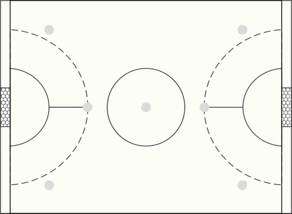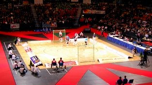 half-time break between halves. The cycle-ball court is 14 by 11 meters,