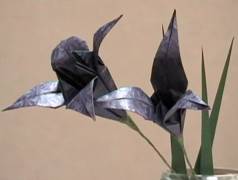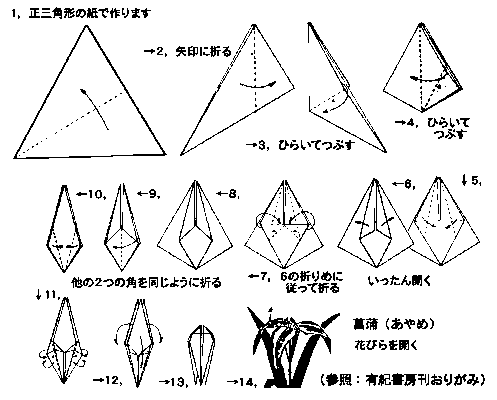 「さつきのころに...」 和紙でちょっと折り紙。 兜と菖蒲・あやめを。 濃い色の和紙も使って。 菖蒲・あやめ(それぞれ四角と三角の紙で折ってあります。) ちょっと珍しい 《正三角形の紙での折り方》 |