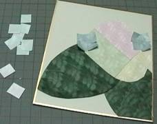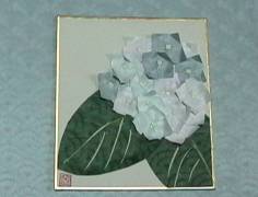 「和紙で紫陽花を・・・」 古典的な折り方で「紫陽花」と「蛙」を。 小さな額にレイアウトして、接着剤で貼り付けていきます。 パステルカラーで。 (「四季」使用) |
