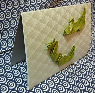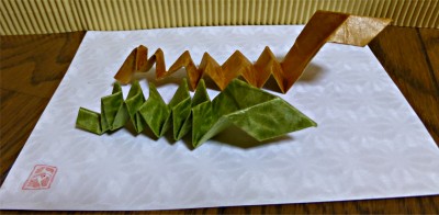 「辰の年・・・」 おりがみで「辰」を・・・。 おりがみを半分に切って、2頭分。和紙に貼り付けて飾っても・・・。 《拡大》 (「おりがみ」使用) |