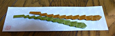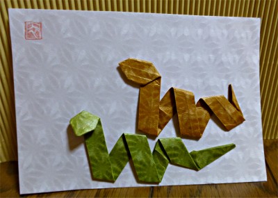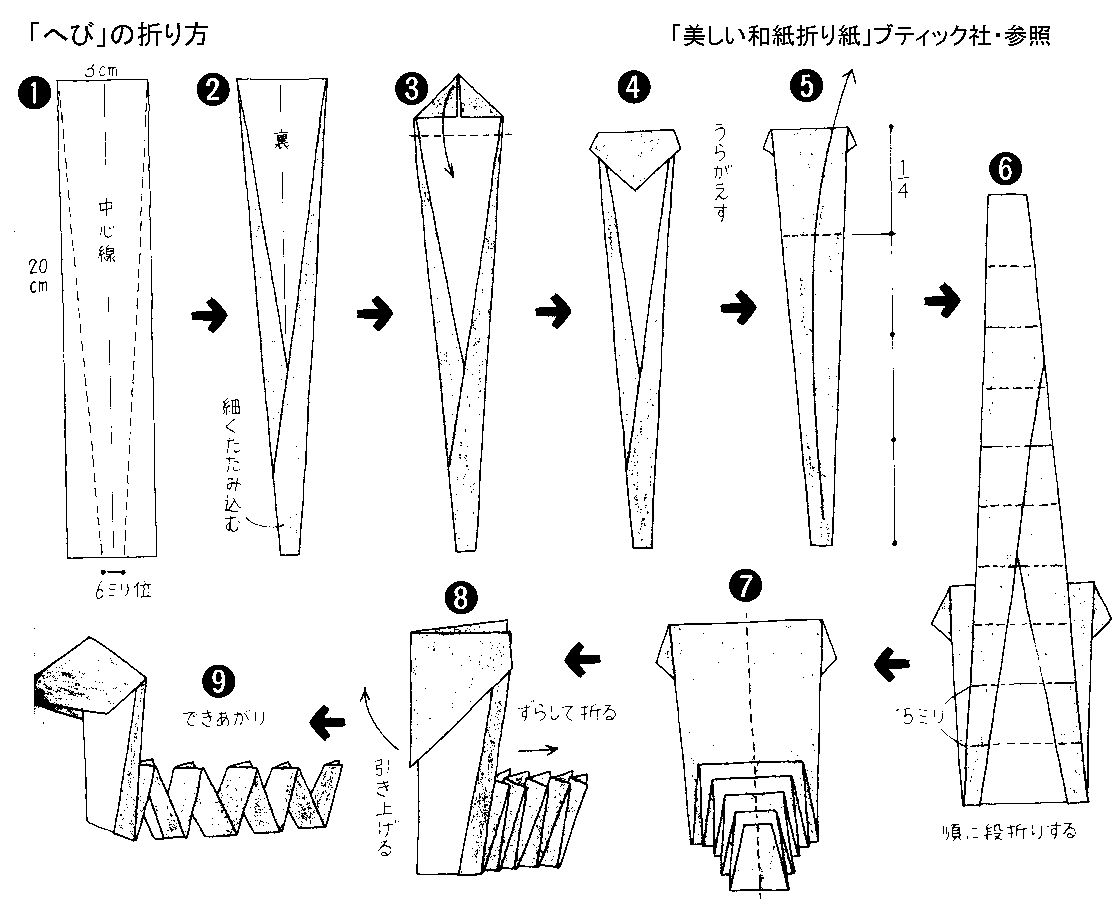 「越前和紙でへびを・・・」 残りの細い紙で出来るへびです。 やさしい色で折ってくださいね。 (小さい紙で折ると箸おきになります。) ≪折り方≫ |