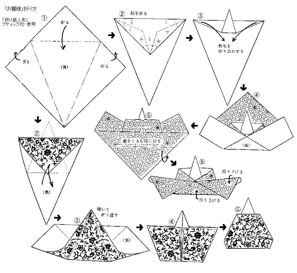 「お雛様・・・」 和紙でお雛様を・・・同じ折り方から2種類になります。(10cm角の和紙を使用) 金銀の和紙などをあしらって。 ≪折り方≫ |