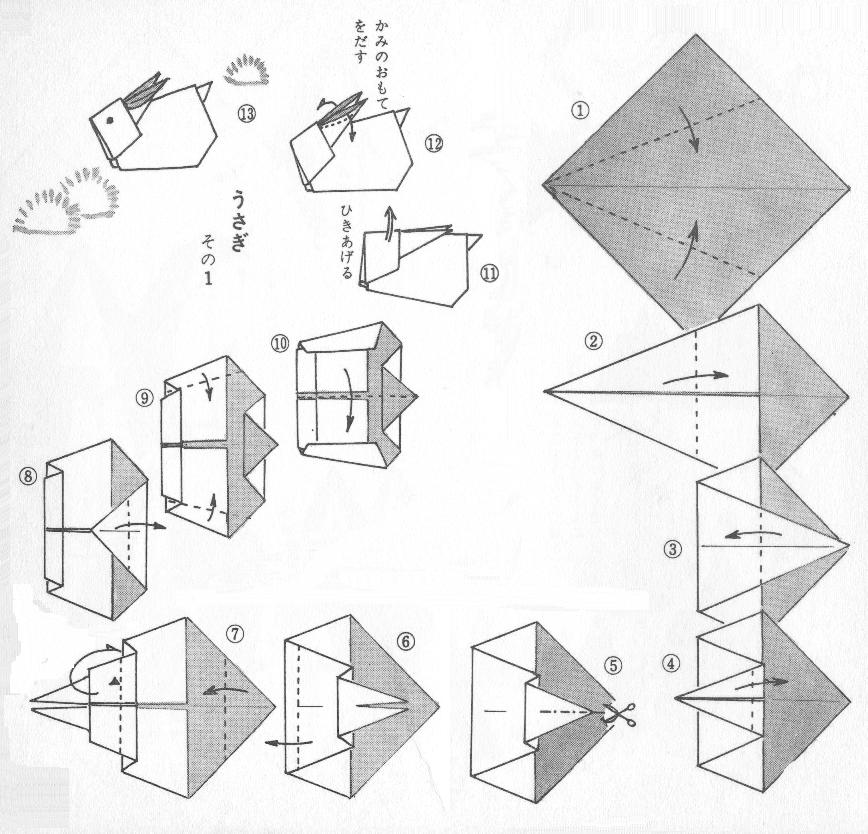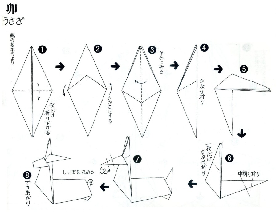 「卯年・・・」 おりがみで「卯」を・・・。 《折り方図》 (「おりがみ」使用) |