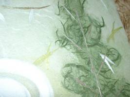 「杉皮紙...」 手漉き和紙の2000年のカレンダーです。 「杉皮紙」というざっくりした感じの和紙です。 模様も漉いてあります。 (部分拡大) |