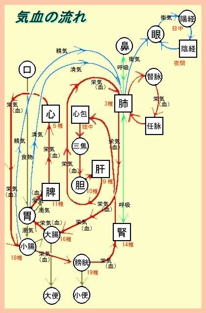 生成された栄気(血)は肺から全身に送られる。肺経、大腸経、胃経、脾経、心経、小腸経、膀胱経、腎経、心包経、三焦経、胆経、肝経、肺経の順に循る。