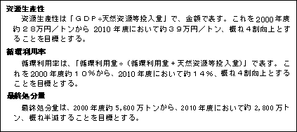 基本計画では具体的な数値目標を設定している。これによると国全体の物質フローに関して、@資源生産性(入り口)、A循環利用率(循環)、B最終処分量(出口)、の3つについて指標と数値目標を掲げていまる。