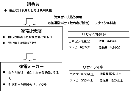 家電リサイクル法は98年6月に公布され、2001年から施行さた。 経産省によると、一般家庭から排出される家電製品は年間約60万トンで、その約8割は販売店によって下取り回収され、約2割が市町村の処理ルートで処理されている。販売店が回収した家電製品は、産業廃棄物業者や資源回収業者によって処理されており、一部の金属資源が回収されている以外、ほとんどが埋立処分されているのが実情であった。 家電リサイクル法は、販売店による下取りという古くからの慣習を制度化し、販売店に戻った廃家電製品を家電メーカーに引き取らせることによって部品・素材のリサイクルを図ろうというものである。