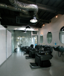 理容店にはみっつの理容イスと個室がひとつあります。