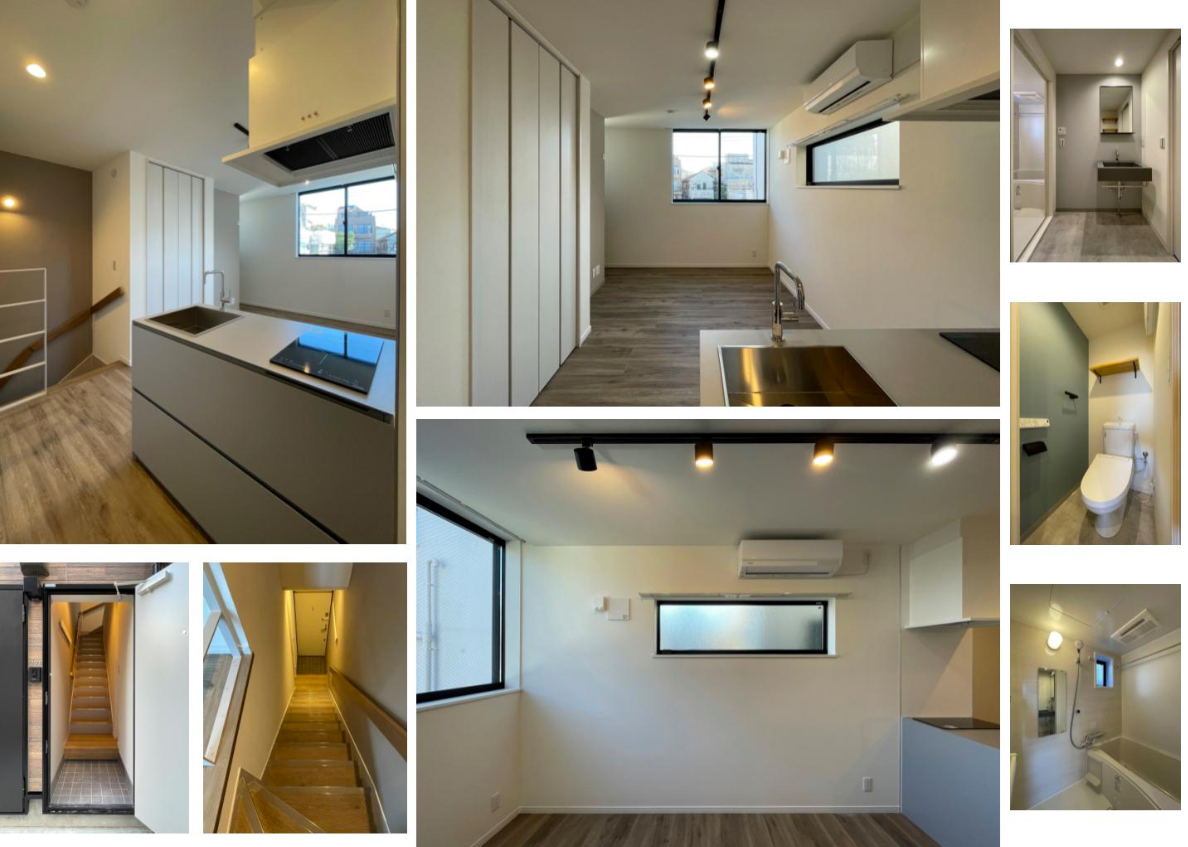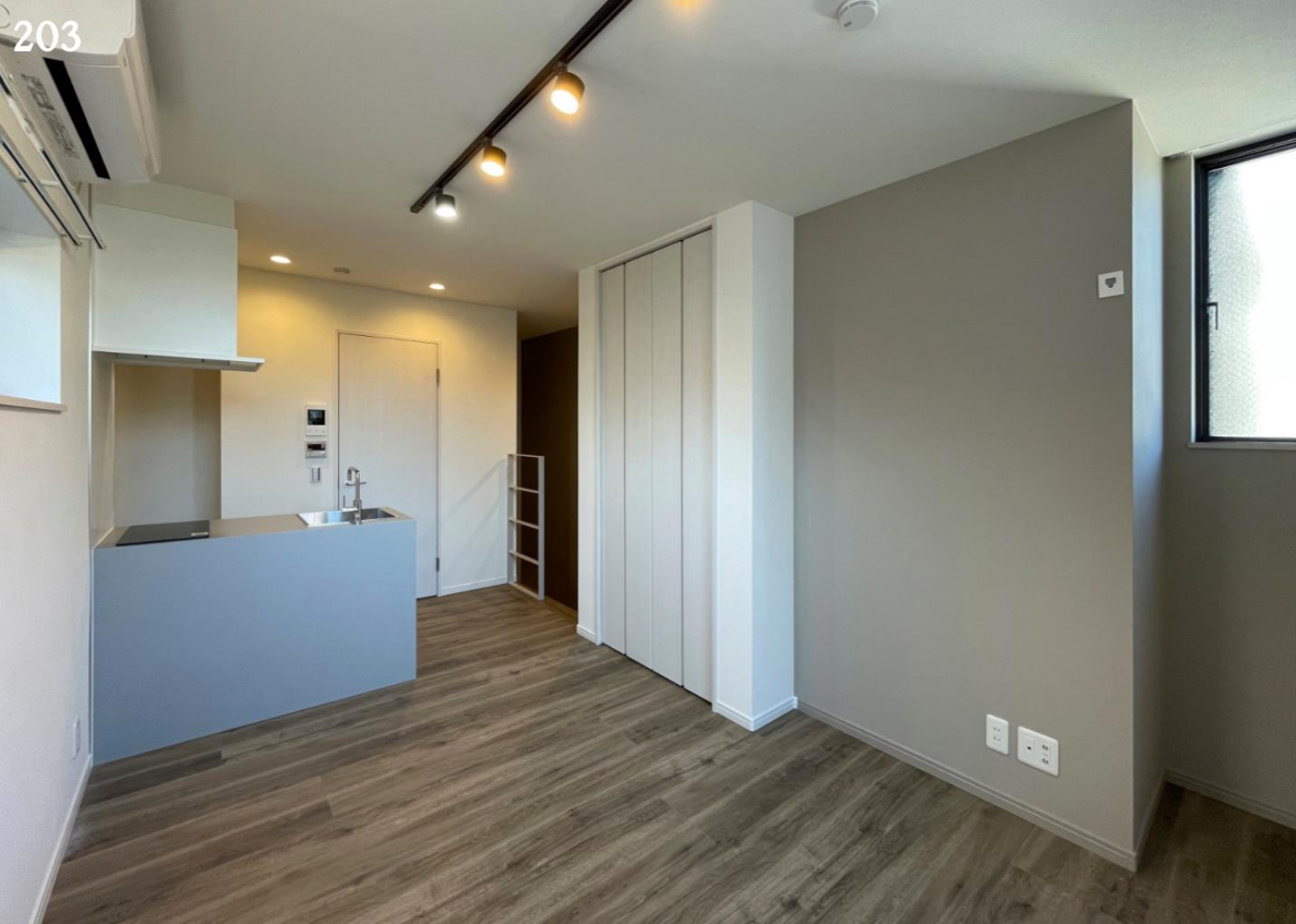 2階南西の1R(26.85m2/8.1坪)。1階玄関から専用階段で2階へ上がる。シンプルなボックス型のペニンシュラキッチン。