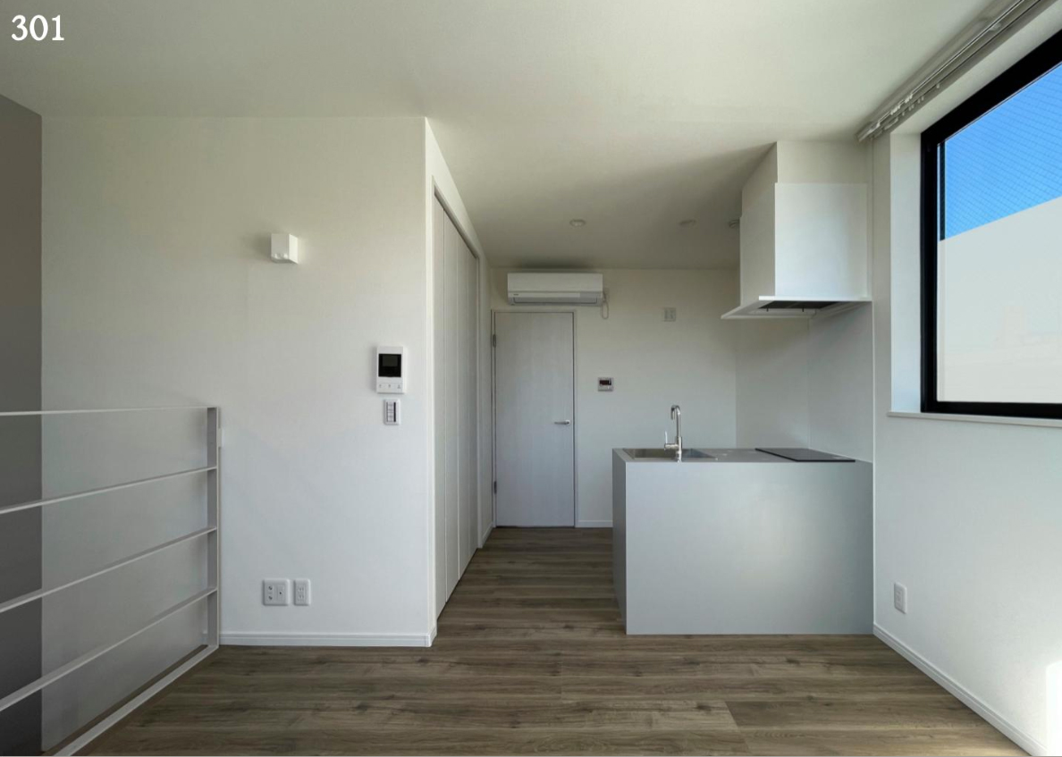 3階南東の1R(30.00m2/9.1坪)。1階玄関から専用の直階段で3階まで上がる。シンプルなボックス型のペニンシュラキッチン。