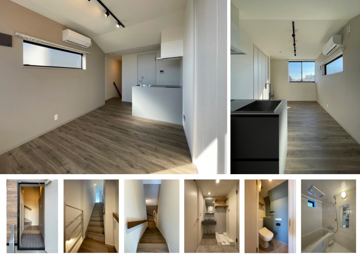 3階南西の1R(31.38m2/9.5坪)。1階玄関から専用の螺旋階段と直階段で3階へ上がる。シンプルなボックス型のペニンシュラキッチン。