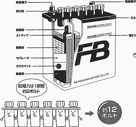 ・鉛と硫酸の反応を利用したバッテリーは起電力が2ボルトのため、6ケ直列に接続して12ボルトとしています。