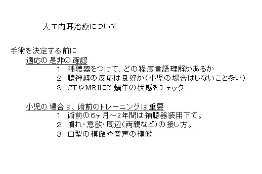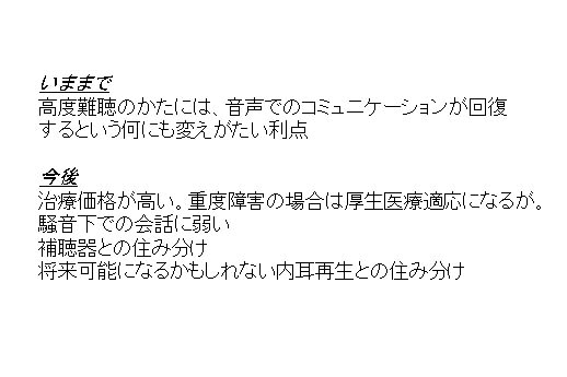 岐阜県難聴者福祉大会講演 (岐阜県ふれあい会館3F大会議室) 人工内耳の現状と将来 岐阜大学医学部 平衡・耳鼻咽喉科学 青 木 光 弘 ![]() 本日は、岐阜県難聴者福祉大会で皆様にお話できる機会を得たことを大変うれしく思っています。現在の日本社会は必ずしも難聴者にやさしい社会とはいえない面が多く見受けられます。補聴器などである程度の聴力を獲得できる方に対して、一般に身体障害者2級以上に相当する高度難聴の方は補聴器をしても会話にならないことが多いようです。そうした方への先進的な治療として開発されたのが人工内耳です。現在、日本でも1994年から保険適応になり、装用者が急激に増加しているようです。 ![]() ダンボは耳がおおきくて、友達からからかわれました。難聴の方々も聞こえないから答えられない。そんなことで、人からからかわれたりすることもあると聞きます。我々耳鼻咽喉科医の力不足で、難聴者にやさしい、住みやすい日本社会とはまだまだいえないのが現実です。 本日は、人工内耳のお話をする前に、聞こえるとはどういうことか、そのしくみについてお話しします。そして、皆さんの難聴がどのような原因でなったのか、その種類について、すこしお話します。 耳のしくみがある程度理解していただいてから、人工内耳のしくみとその治療についての現状についてお話して、皆様がいだいているだろう人工内耳に対する不安や疑問について少し説明させていただきます。 ![]() われわれがはなす言葉や音は、空気の振動です。ソプラノ歌手や子供のかん高い声は速い空気の振動です。逆におじさんがしゃべる低い声は遅い空気の振動です。そうした声や音が耳から入り、鼓膜、耳小骨に伝わります。そして、カタツムリの形をした蝸牛のなかの細胞を刺激して、脳に伝わって、言葉や音を理解します。高い音と低い音では、刺激される蝸牛のなかの細胞が異なります。それにより、我々は音の違いを認識できるわけです。 したがって、これらのどこが悪くなっても聞こえがわるくなります。 ![]() 先ほどのカタツムリをきりますと断面は3つの部屋に分かれています。そのなかでも真ん中の部屋が重要です。その中にはリンパ液という液体が流れていて、先ほどの音や声の空気振動が液体の波動に変換されて、ここに伝わります。熱いスープを覚ますために、フーとしたときにスープの表面に波ができるのを経験されたことがみなさんあると思います。まさにそれと同じで、音の振動が液体の振動に変換されるわけです。 ![]() 先ほどの真ん中の部屋を拡大するとスライドのような複雑な構造になっています。先ほどのべましたように空気の振動が液体の振動に変換され、その波により有毛細胞と言われるものが刺激を受けて興奮します。大きな波と小さな波、早い波と遅い波といった違いにより有毛細胞の刺激され方がちがっています。その違いにより音や声の区別が可能になります。神様はすごく巧妙なしくみを生物につくられたものです。 ![]() 先ほどのどの部分が悪くなっても聞こえなくなります。 そうした難聴には大きく分けて2種類あります。中耳炎などに代表される伝音難聴は、鼓膜に穴があいたり、耳小骨が外れたりすることで音が伝わらなくなった状態です。これは、手術により鼓膜の穴をふさいだり、耳小骨のつながりを作り直すことで聴力の再獲得が可能です。 しかし、蝸牛を含めてそれより奥の機能が喪失してしまった難聴を感音難聴といいます。この場合、聴力の再獲得が困難なことが多く、補聴器などをしてもよく聞き取れない場合も少なくありません。そうした難聴者のほとんどは蝸牛の有毛細胞に原因があります。 ![]() 先ほどお見せした感音難聴になるものには、生まれつきといういわゆる先天性難聴があります。最近は遺伝子の研究が進み、半数が遺伝子レベルでの原因ということがわかってきました。 また、突然発症するものでは、おたふく風邪に代表されるウィルス性内耳炎によるものや、抗生剤などによるものがあります。 徐々に進行していく難聴にはメニエール病がその代表で、ほか原因不明の進行性難聴も見られます。 ![]() 中耳伝音系の異常でおきた難聴は鼓膜、鼓室形成術などにより聴力の獲得が可能です。補聴器は元来伝音難聴の方に有効なものですので、手術をしなくとも補聴器の効果が見られます。また、埋め込み型補聴器のような感じのものとして人工中耳があります。これは鼓室形成術をしても効果がない伝音難聴のかたが対象になります。 感音難聴で聴力が固定してしまった場合は補聴器を装用することになりますが、補聴器をしてもうまく聞き取れなく補聴器の装用効果が見られない場合に本日お話する人工内耳の適応になります。また、将来いつなるかわかりませんが内耳を再生させてふたたび自分に植える内耳再生治療がいま研究されています。現状では人工内耳手術が高度難聴者への唯一の治療となります。 ![]() 人工内