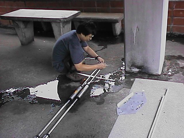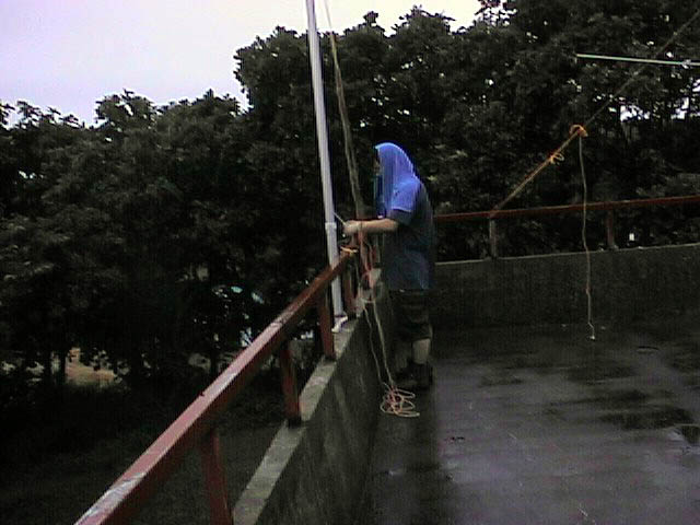 *後は、80Mだけあと、80mのダイポールと言ったところで、雨がまた降り出してきた。この給電部分の支柱もお化けポールを投入した。約50%短縮が飛びについて懸念されると本人は、言っていたが、移動の割には端を含めて結構あげている方だと関心した。 *完成