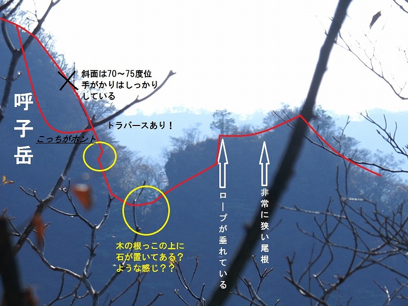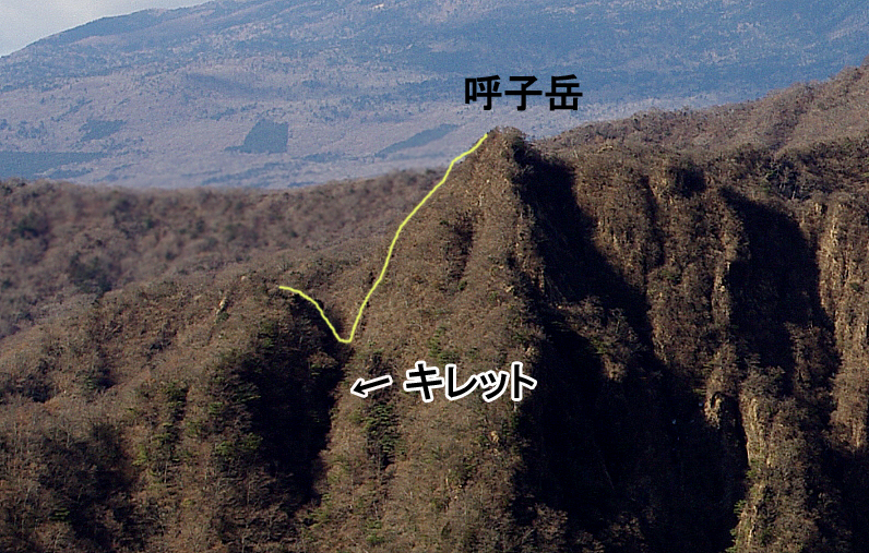 最後に呼子岳が見えてきますが、呼子への取付き部にはロープでおります。さらに呼子と稜線は鋭く切れており岩1枚でつながっている状態です。