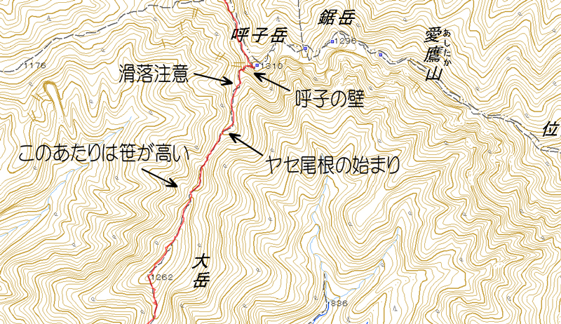 呼子廃道の最終部の痩せ尾根は鋸岳と同様の侵食過程にあり大変危険です。