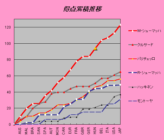 第三ステージでM・シューマッハが26点をたたき出したのに対し、クルサードはわずか6点でした。ここで24点差に開きました。