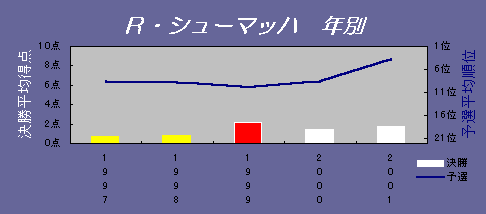 決勝で成績を残していないのは、モントリオールです。97年から4年連続ノーポイントです。また、鈴鹿ではスピンやクラッシュが目立ち、ミハエルやミカについていけない感じでした。