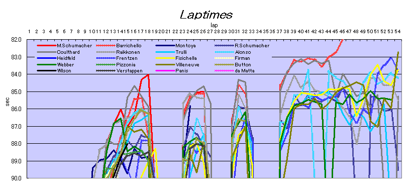 ライコネン2連勝 フィジケラ幻の勝利 (4/6) 54周目、ウェバーとアロンソがクラッシュ。赤旗となり、周回の75%を消化していたためレース成立。ライコネンが優勝。フィジケラが勝ったかに見えたが、レースは53周目時点と見なされた。 バリチェロも止まり、フェラーリ5年ぶり全滅 (4/6) 48周目、バリチェロがクルサードを追い抜いて1位になって間もなく、マシンが止まった。フェラーリが2台ともリタイヤしたのは1998年ベルギーGP以来。 コースが乾いていく中、1位クルサードがピットイン。フィジケラがライコネンを抜いた。 ミヒャエルがクラッシュ、連続完走止まる (4/6) 26周目、ピッツォニア、モントーヤがクラッシュ。M・シューマッハもスピンしてクラッシュ。 シューマッハは連続完走記録が24で止まった。3戦して勝てず。 三度目のセーフティカー。ライコネンここで入り順位を落とす。1位クルサード、2位バリチェロ、3位ラルフ。 2度のセーフティカー (4/6) セーフティカーによるスタート。8周目に再開され、ライコネンがトップ、クルサードが続きマクラーレン1-2。M・シューマッハが3位に浮上。バリチェロは後退。 18周目、ファーマンの右フロントが壊れ、パニスが巻き添えリタイヤ。再びセーフティカーが入り、各車給油。ライコネン入らず。 雨でスタート遅延 (4/6) 日曜は雨になった。スタートが遅延している。ウィングと車高は変更可となった。 |