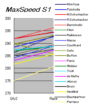 maximum speed The maximum speed went up in the race from the qualifying. Sauber C23 very similar to F2003-GA showed the speed about the same as F2004. C23 inherited the characteristic of F2003-GA in respect of aerodynamics. But since rear also succeeded the nervous field, it was not connected with a time. Sato was equal with Button at the maximum speed. It is thought that both time difference is in a cornering. Renault's power is insufficient Since Renault was considerably inferior at the maximum speed, he cannot deny the shortage of power. Just since Alonso knows this, unreasonableness has produced it in the battle in a race. McLaren was not able to transfer Mercedes from the shortage of reliability. Although Williams had strongest BMW, it was not able to be employed efficiently. Not only a time is late, but was Toyota inferior in the maximum speed. Although possibly the lateness of a corner ring and delay of aerodynamics pulled the leg, power is also made to regard it as whether it has come out so much. |